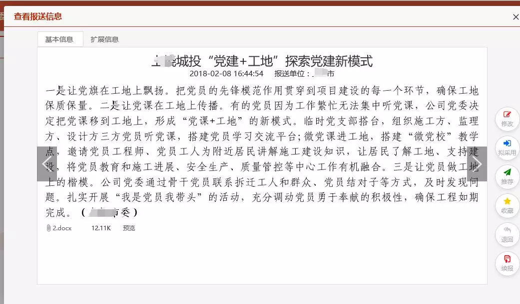 新的信息报送系统是一套完整业务的信息报送系统,符合政务业务部门的需求,可以独立系统部署,也可以集成于正拓JavaOA协同办公平台。功能包括上报、筛选、推荐、采用、编刊、约稿、续报、重报、催办、审批、分发、积分统计等功能。