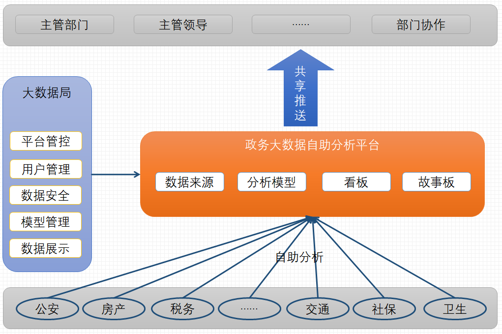1、打破数据壁垒,整合各政务系统,实现业务数据的全景综合分析展示,为各级政务决策提供充分的数据依据。