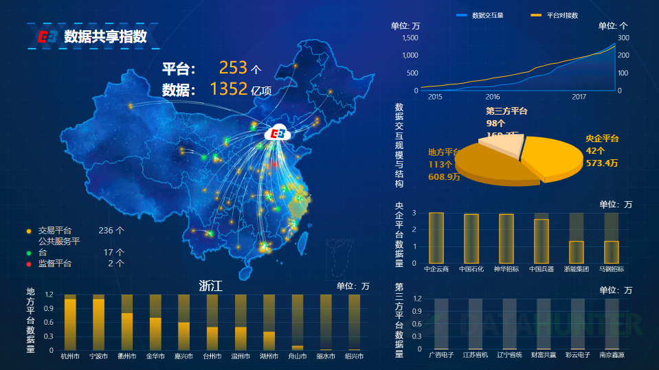 3、完善数据可视化展示体系。在数据分析完成之后,通过Data MAX 数据大屏展示平台将这些数据进行可视化展示。其可以围绕各类政务业务主题,整合相关业务形成的复杂多样的海量数据,以地图、图表、动画等形式直观展现,提供全方位的业务数据聚合、整理、分析、展示和互动。其不仅是政府部门以及人员接收数据洞察的重要渠道,也是增强对外展示的一扇窗口。